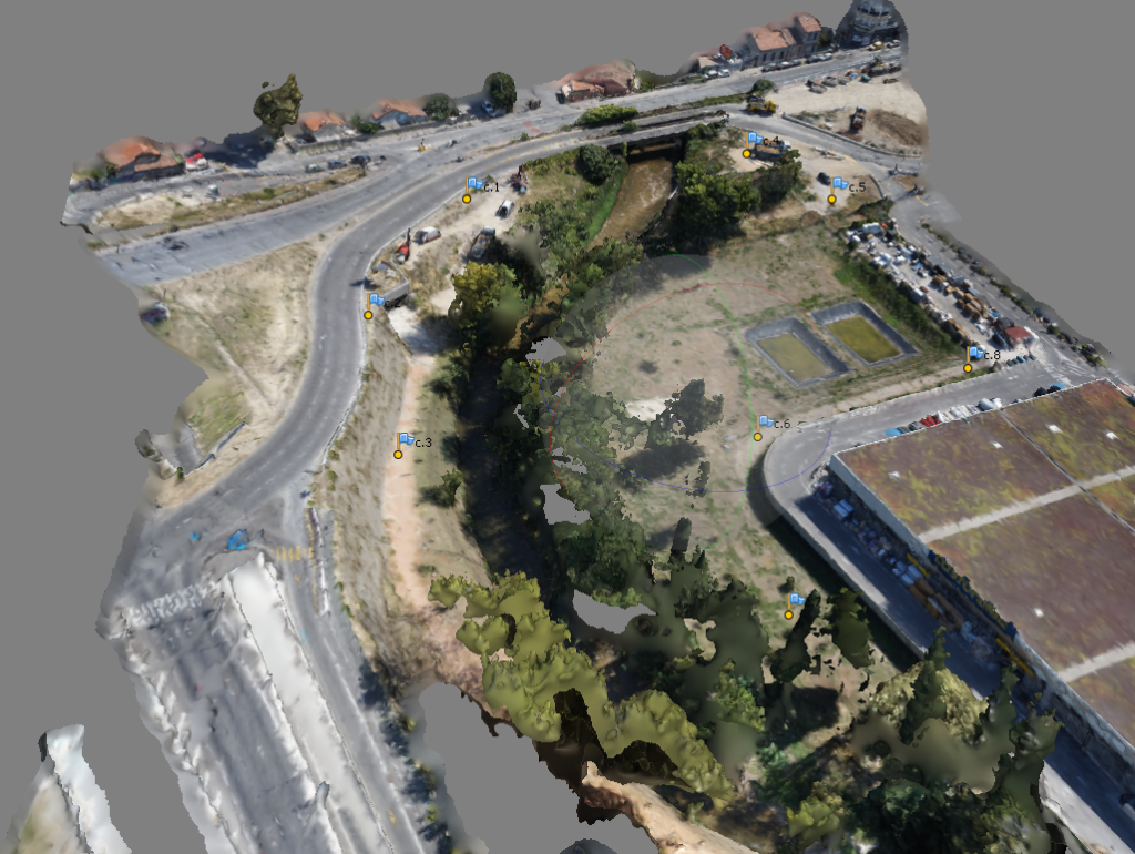 Réalisation de deux ponts sur l'Huveaune reliant la L2 au Boulevard Urbain Sud pour la société Bouygues TP et dessinés par l'architecte Ruddy Ricciotti, MAP 4D a effectué une photogrammétrie pour l'état des lieux, mis en place la polygonale secondaire et commencé les premières implantations pour le terrassement...